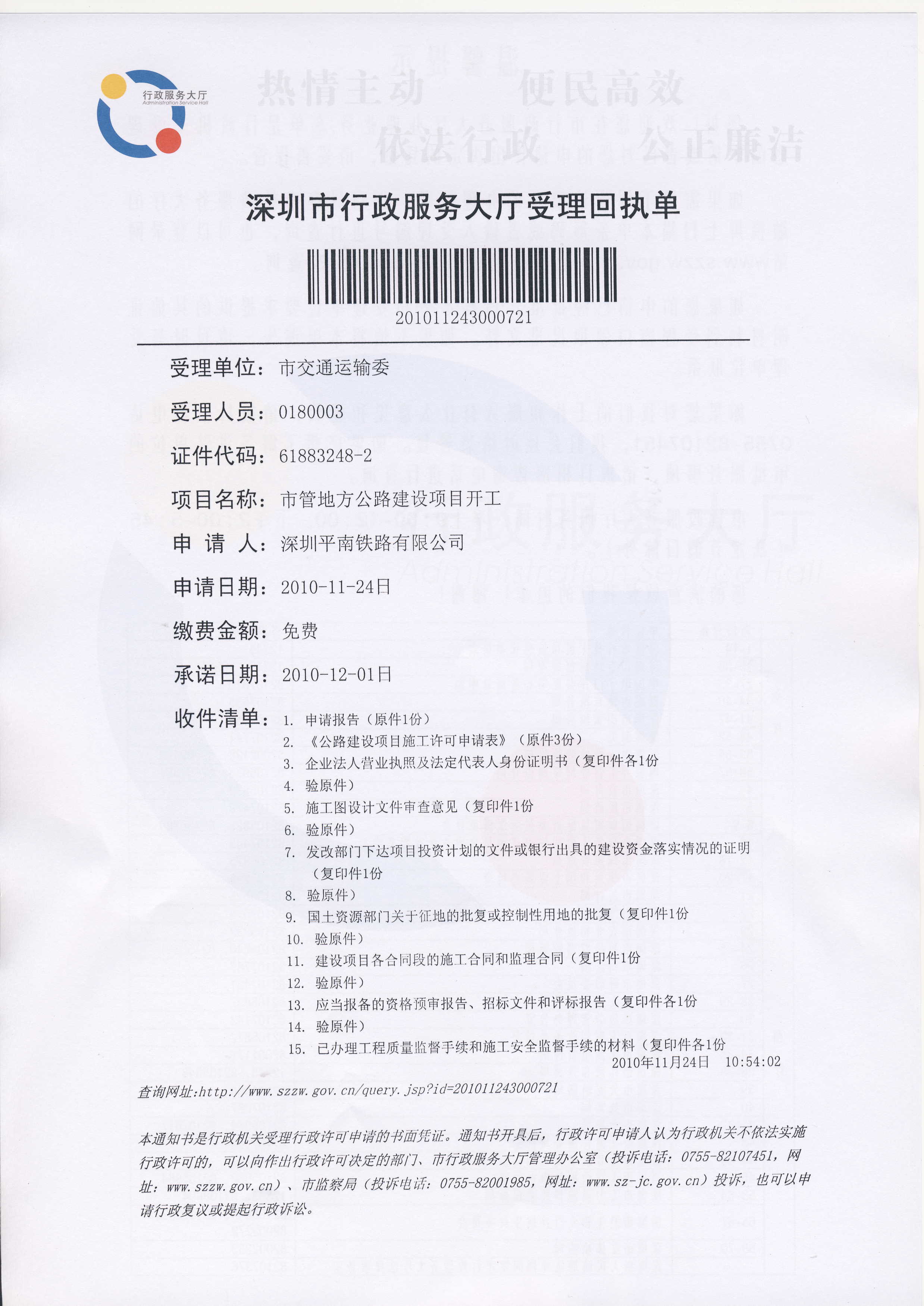 深圳市行政服务大厅受理回执单:201011243000721