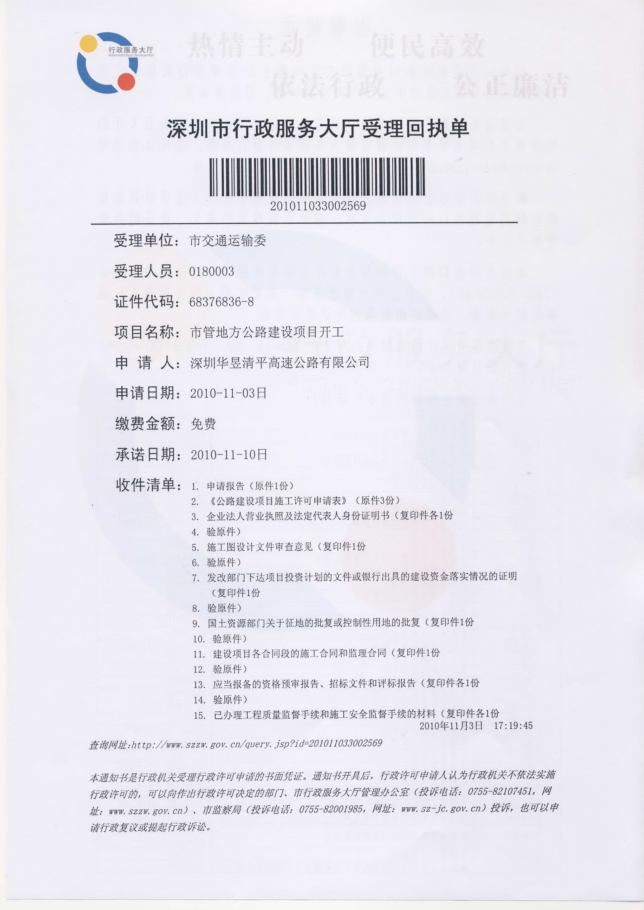 | 名称: | 深圳市行政服务大厅受理回执单(201011033002569) | ||