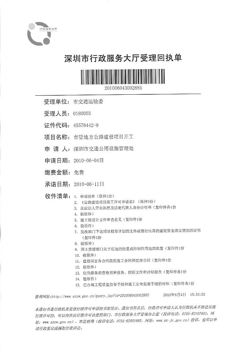 | 名称: | 深圳市行政服务大厅受理回执单:201006043002885 | ||