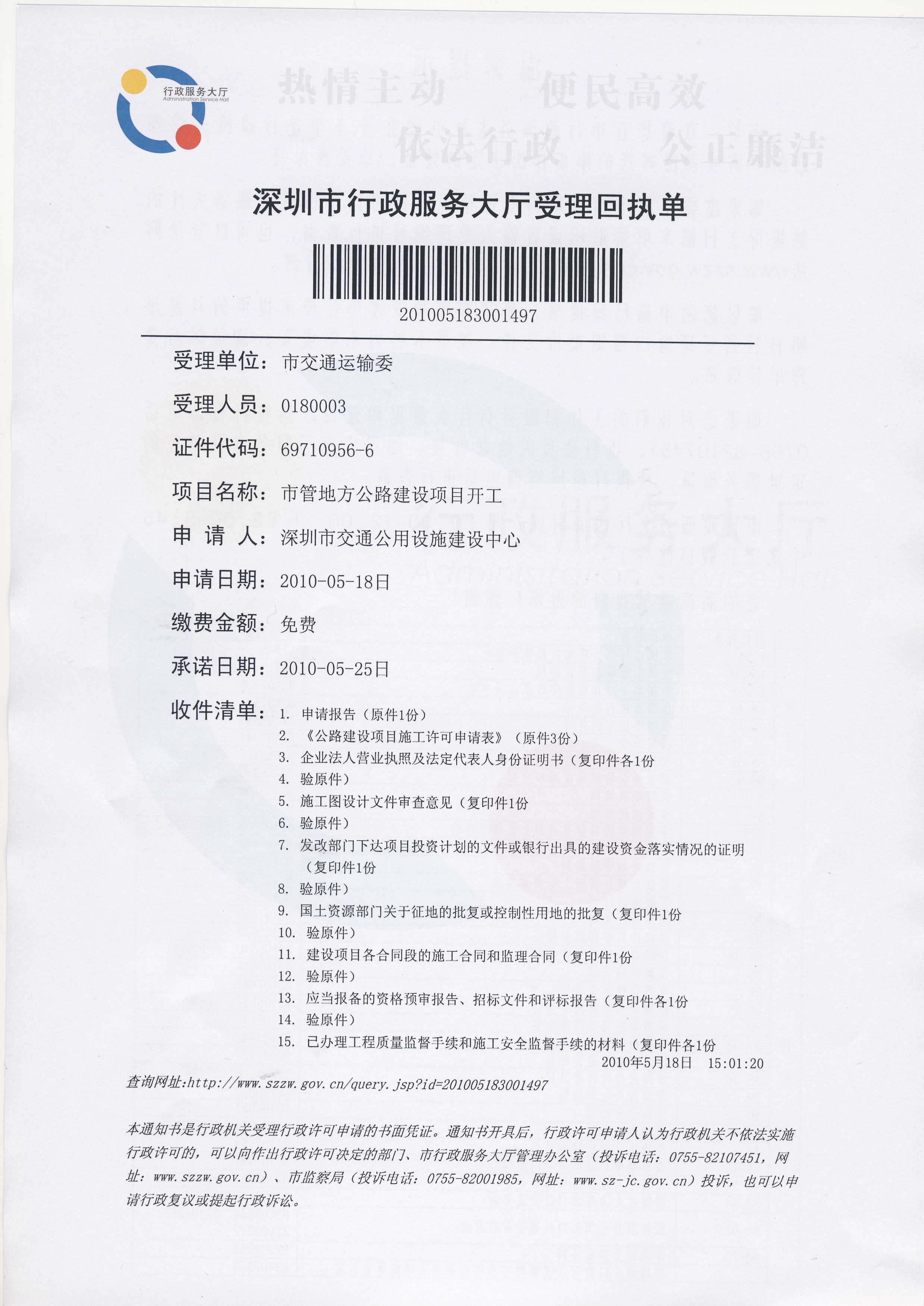 深圳市行政服务大厅受理回执单:201005183001497